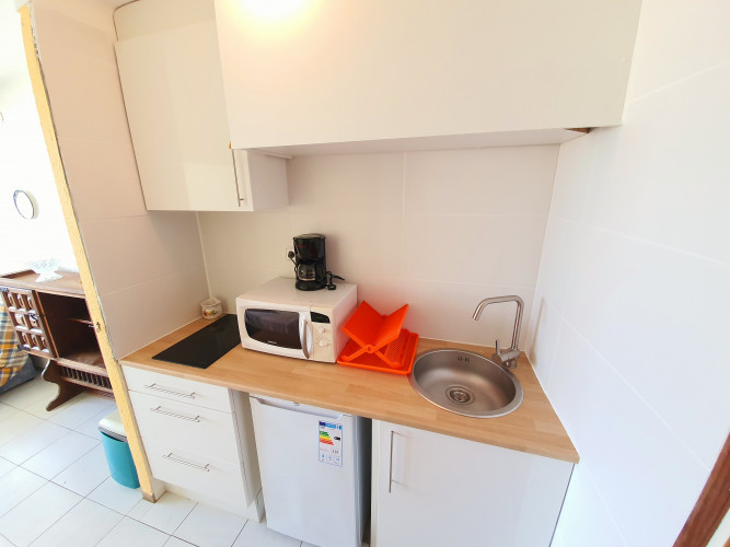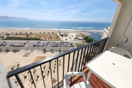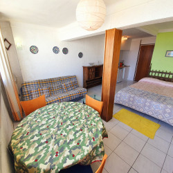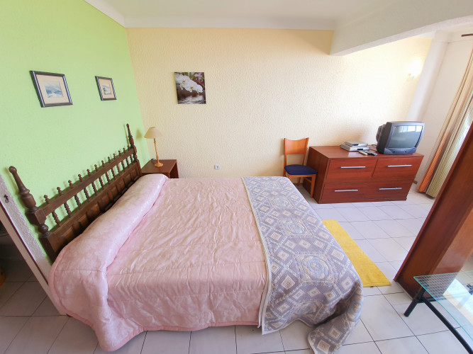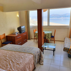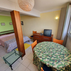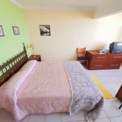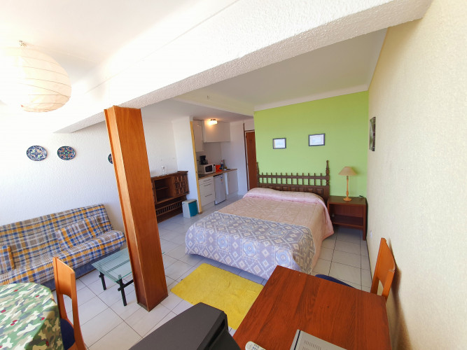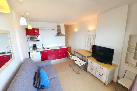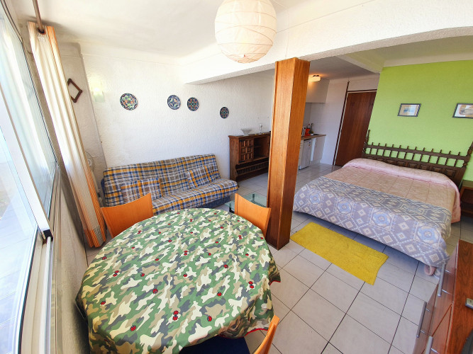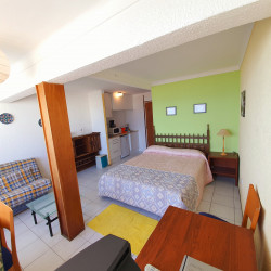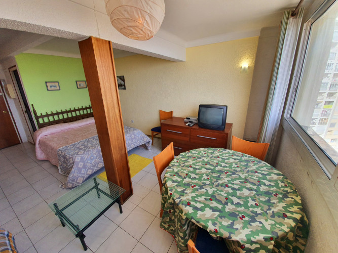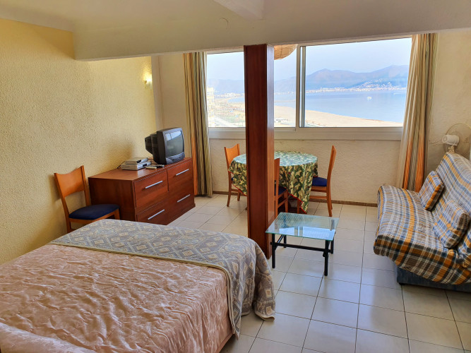Estudio de origen (solo reformada la cocina) en primera línea, a solo 50 mts. de la playa, compuesto de: salón comedor con cama de matrimonio de 1,50, sofá cama, mesa y sillas, televisión, práctica cocina americana reformada con nevera, microondas, cafetera…; cuarto de baño con ducha, de orgien.