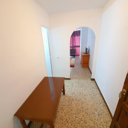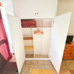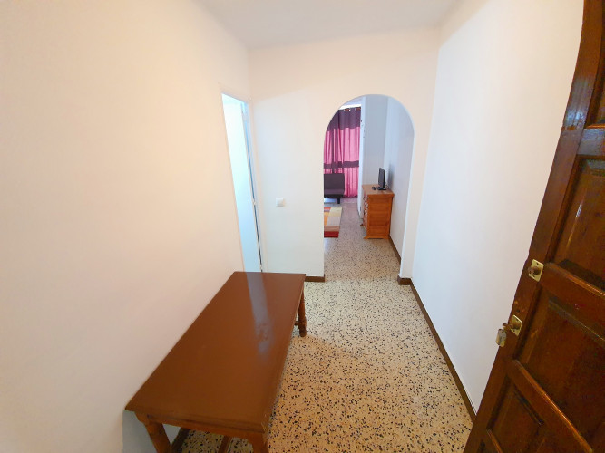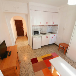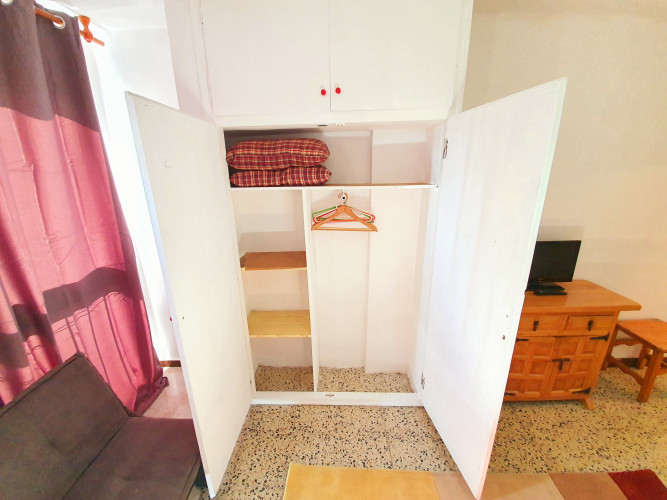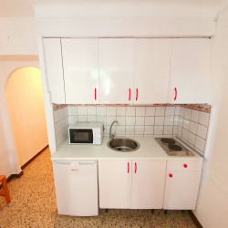 Distribución: recibidor; salón comedor / estar con una cama de matrimonio (abatible) y una cama individual plegable, mesita y sillas, sofá clic-clac, TV de pantalla plana y pequeña cocina abierta compartiendo espacio con el salón, la cual dispone de muebles para guardar el menaje y en la que se encuentra el frigorífico, el microondas, una cafetera y demás elementos básicos de cocina para pasar una estancia temporal; baño con ducha en el que se encuentra la lavadora.